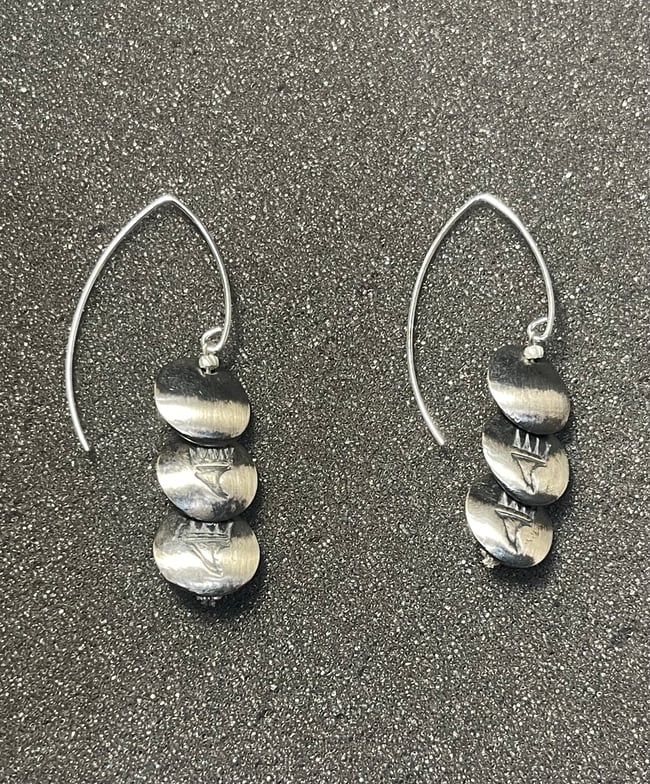 Native American handmade Sterling Silver vintage earrings. The earrings have bear claws stamp with long Sterling Silver earring hooks. The product has the Sterling Silver stamp with the initial SD made by Shernisha Daukei.